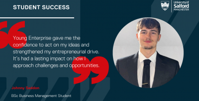 Salford Business School student Johnny Seddon has turned his experience on the Level 5 Young Enterprise module into a launchpad for professional success, earning regional recognition, employment with one of his mentors, and ongoing collaboration with the next generation of Salford entrepreneurs.