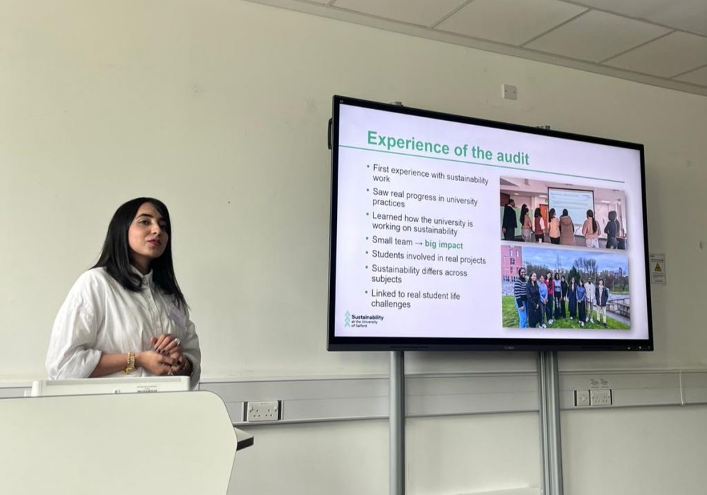 I talked about how this was my first experience with sustainability work, and how much it opened my eyes. How sustainability isn’t just theory, it connects to real student life challenges, to careers, to the world we are all graduating into. How being part of a small team of student auditors showed me that students can create real impact, right now, not just in the future. And as an international student from Pakistan, I also brought a global perspective to the conversation, thinking about how these ideas and frameworks can travel beyond the UK and inspire change in other parts of the world too.